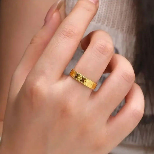 Made from high-quality stainless steel with a luxurious gold finish, this band-style ring features delicate four-leaf clover engravings that symbolize luck, hope, and happiness. The dotted detailing along the edges adds a vintage touch while maintaining a clean, contemporary aesthetic.