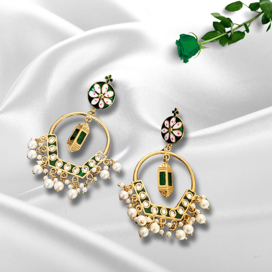 Add a touch of elegance in your ethnic style by adorning these pair of beautiful jhumkas. It has shimmering flower motif with pretty glossy pearl danglers to give your ethnic looks just the right amount of royal touch.